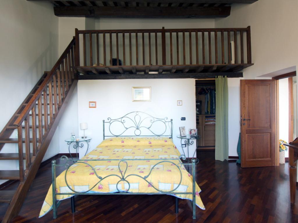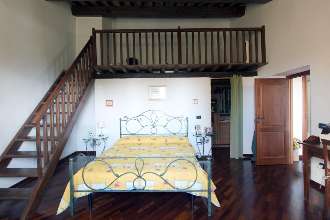 Piano Superiore: La zona notte ospita due ampie camere matrimoniali, di cui una con cabina armadio e soppalco, uno studio luminoso e un grande bagno padronale con vasca e doccia.